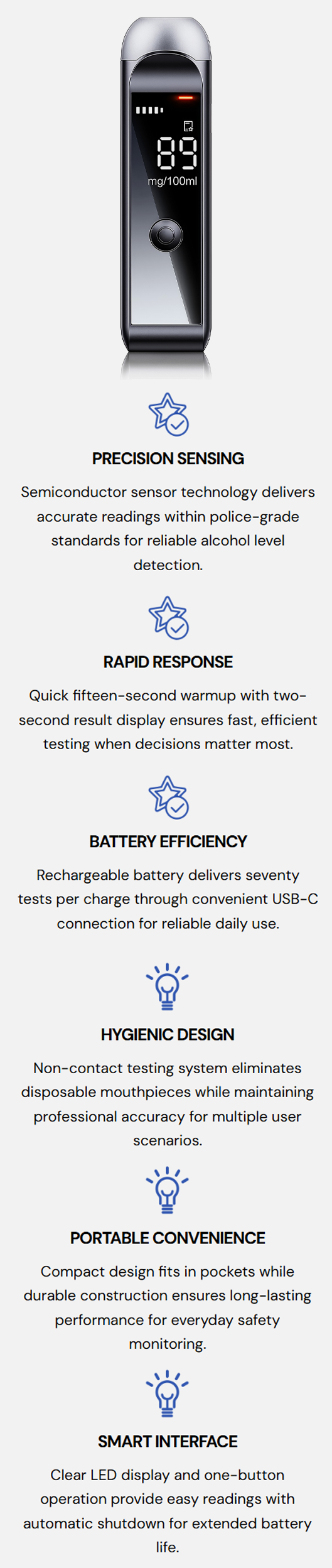 - High-Precision Sensor + Dual-Filter Algorithm (DFFA) - accurately detects alcohol levels, ensuring precise results even with overnight alcohol.