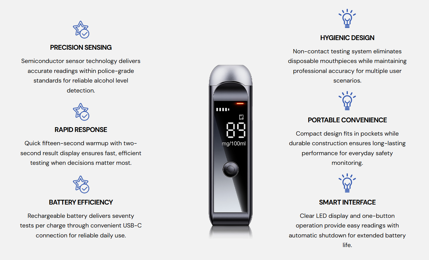 - Sound and Light Alerts - clearly indicates alcohol levels with light and sound alerts, ensuring safe driving decisions.
